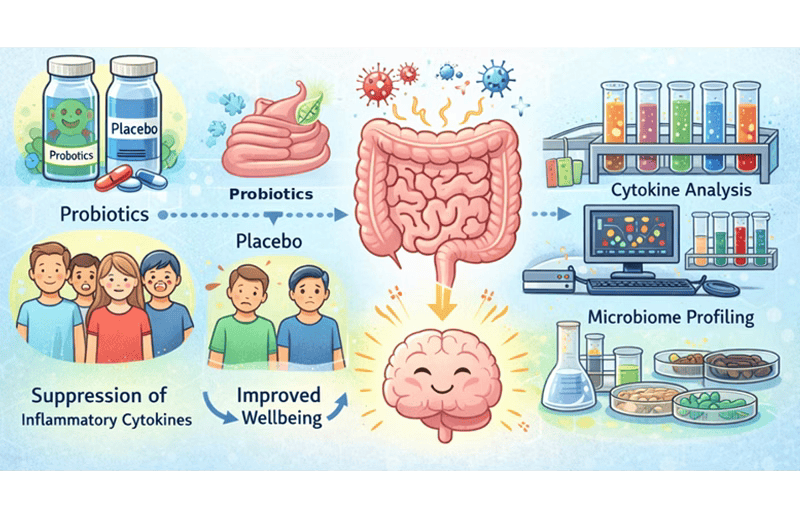 This study will evaluate the effects of a multi-strain probiotic on circulating cytokines and wellbeing through a randomised double-blind, placebo-controlled trial. The intervention is a probiotic selected as a safe, acceptable and scalable mechanistic probe that perturbs the gut environment without adverse clinical effects.