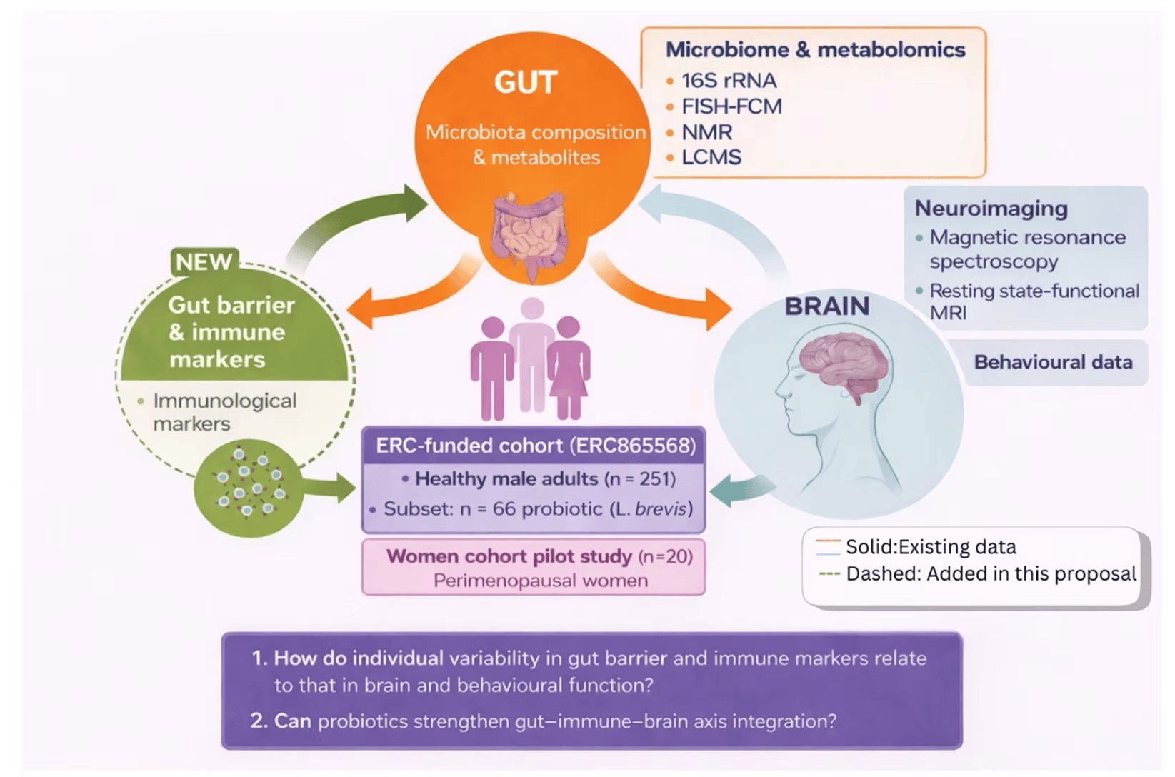 This project will investigate how gut barrier integrity and immune variability relate to other components of the gut-immune-brain axis. The team will generate new systemic immunological profiles to complement and integrate neurobehavioural and cognitive (resting-state fMRI, magnetic resonance spectroscopy, behavioural measures including facial emotion recognition, motor performance and tactile sensory function), microbiome, and metabolomics data from an existing large cohort of healthy individuals. This dataset also includes subsets of participants exposed to gut microbial modulation interventions (probiotics).